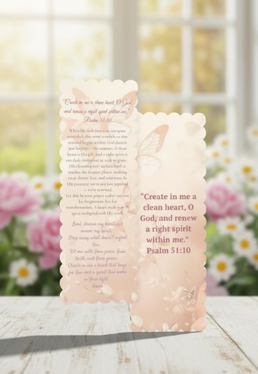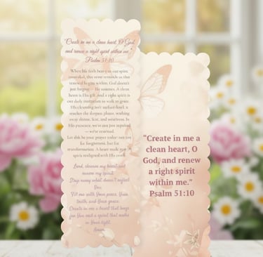 Let this elegant Psalm 51:10 bookmark be a daily invitation to renewal and grace. Featuring the verse “Create in me a clean heart, O God, and renew a right spirit within me,” this design blends soft florals and butterflies with a prayerful reflection that speaks to healing, restoration, and spiritual alignment. Perfect for personal devotion, gifting, or tucking into your Bible, it’s a gentle reminder that God’s cleansing reaches the deepest places — washing away shame, fear, and weariness.