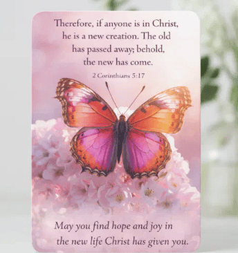 This elegant 3.5 x 5 inspirational card features a radiant butterfly resting on soft pink blossoms, symbolizing transformation, renewal, and the beauty of new beginnings. Paired with a heartfelt blessing, this design gently encourages peace, grace, and spiritual strength through God’s love. Perfect for gifting, encouragement, or quiet moments of reflection, it serves as a reminder that life continues to bloom under His care.