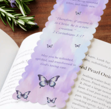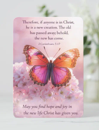 This inspirational Christian bookmark features a soft watercolor background in purple, pink, and blue with elegant butterflies that symbolize renewal and transformation. The scripture from 2 Corinthians 5:17 reminds the reader of the promise of becoming a new creation in Christ. Perfect for Bible study, devotionals, prayer journals, or as an encouraging gift, this bookmark brings peace, hope, and spiritual uplift to anyone who receives it.
